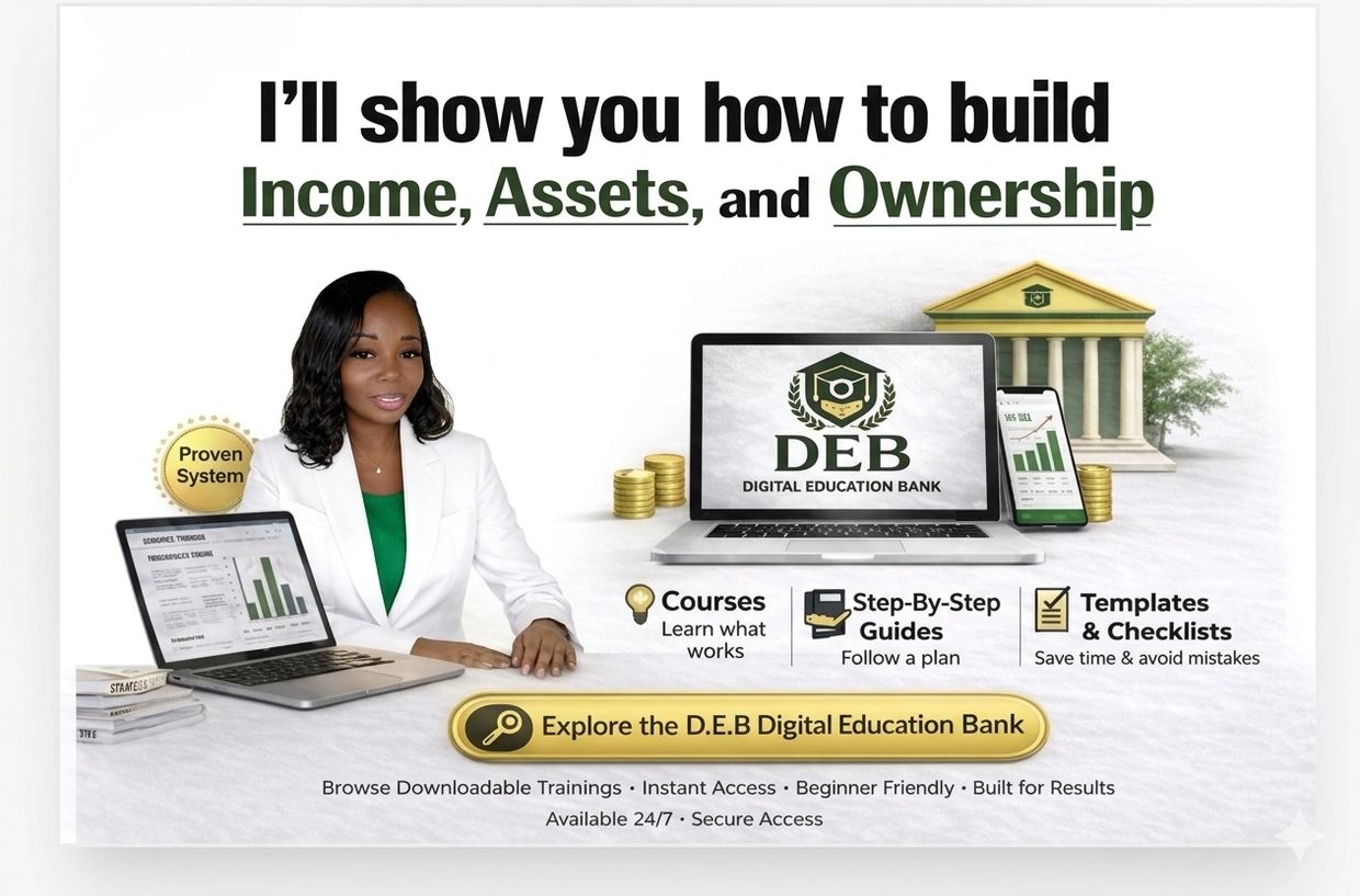D.E.B. is your knowledge bank for building multiple streams of income with clarity and confidence. Inside, you’ll learn how to turn what you already know into digital products, publish books that position you as an authority, and use real estate to build long‑term wealth. With practical tools, proven systems, and step‑by‑step guidance, D.E.B. helps you create income you can depend on and wealth that lasts. Whether you’re starting your first stream or expanding your path to ownership, this is where your knowledge becomes your most valuable asset.